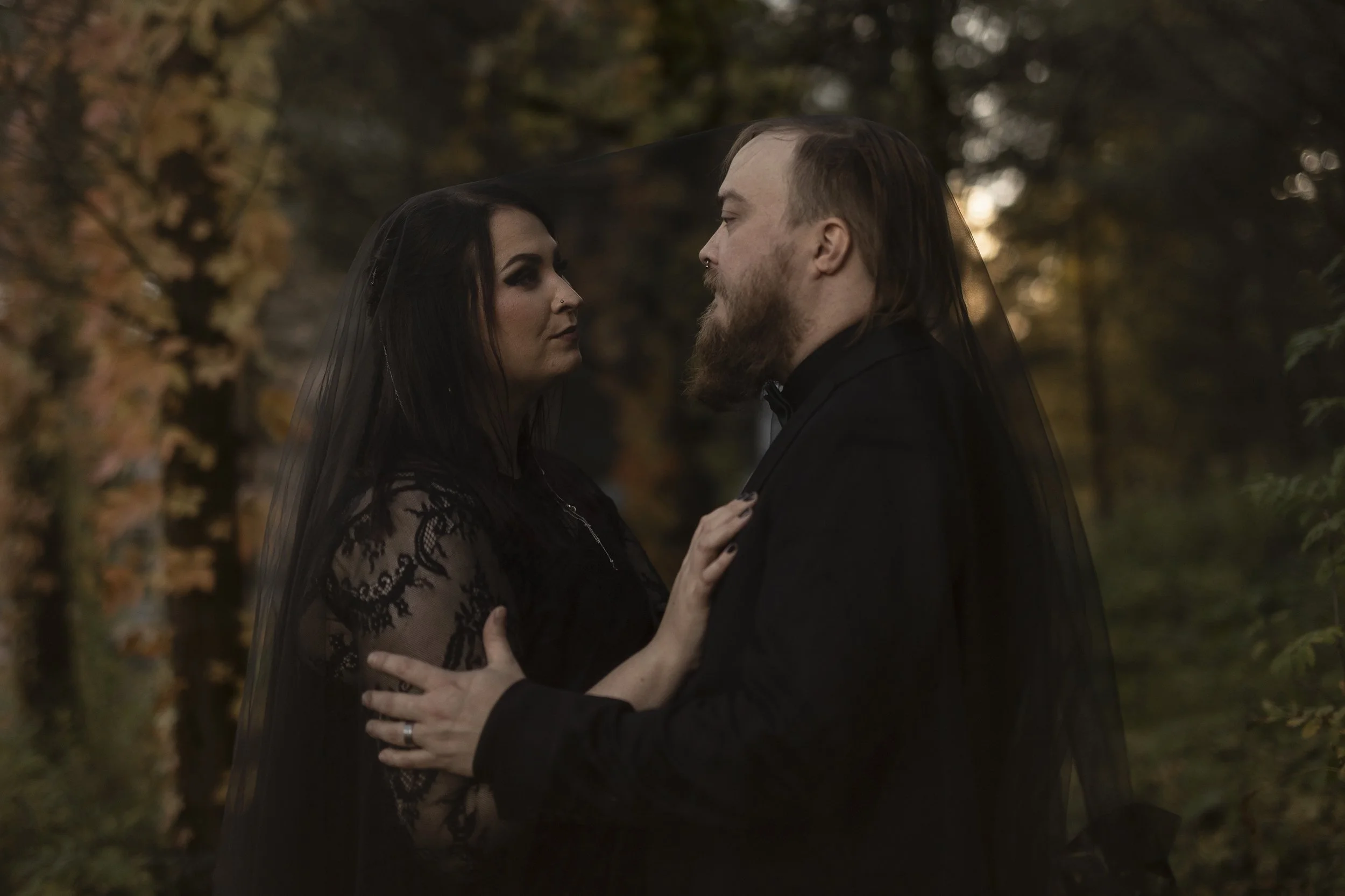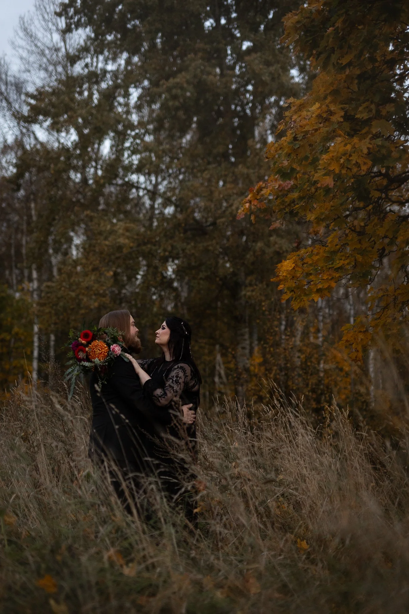 Minulla oli toinen hääkuvaus Puotilassa melkein tasan vuotta ennen sovittua ajankohtaa, ja niiden aikana totesin, että Puotilan kappelin ympäristö täyttää kaikki toiveemme syvistä syksyn sävyistä. Pidimme vaihtoehdot avoinna koko vuoden, mutta päädyimme Puotilaan. Hääpalaverissa tuli pyyntö “goottityylistä hyvällä maulla”, ja rakastin tehtävänantoa!