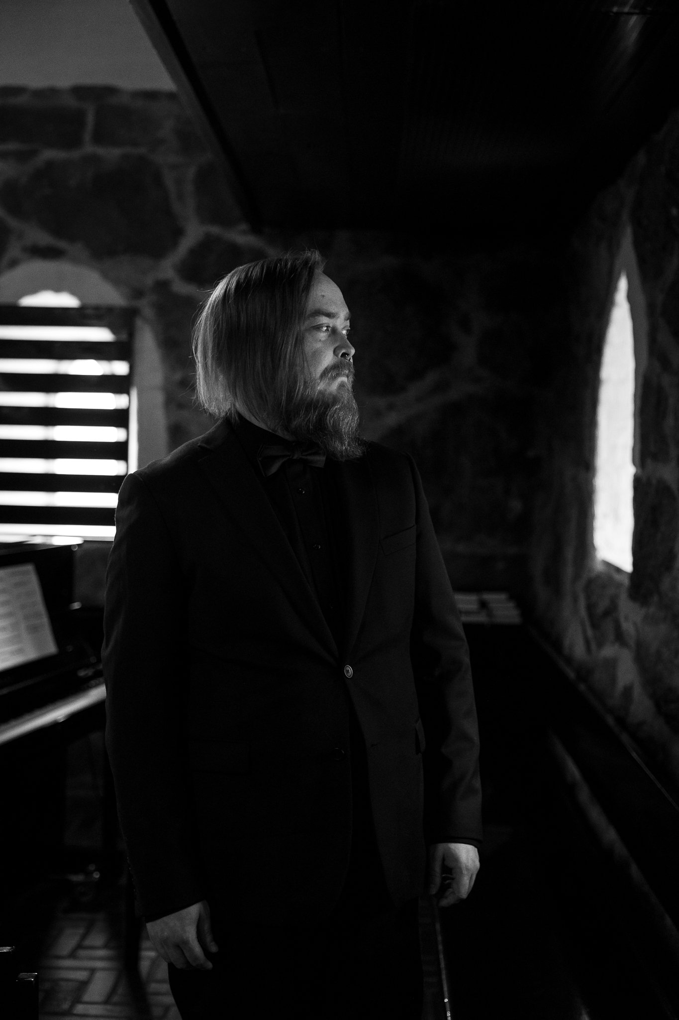 Hääkuvaus puotilassa, musta hääpuku, tummat hääkuvat