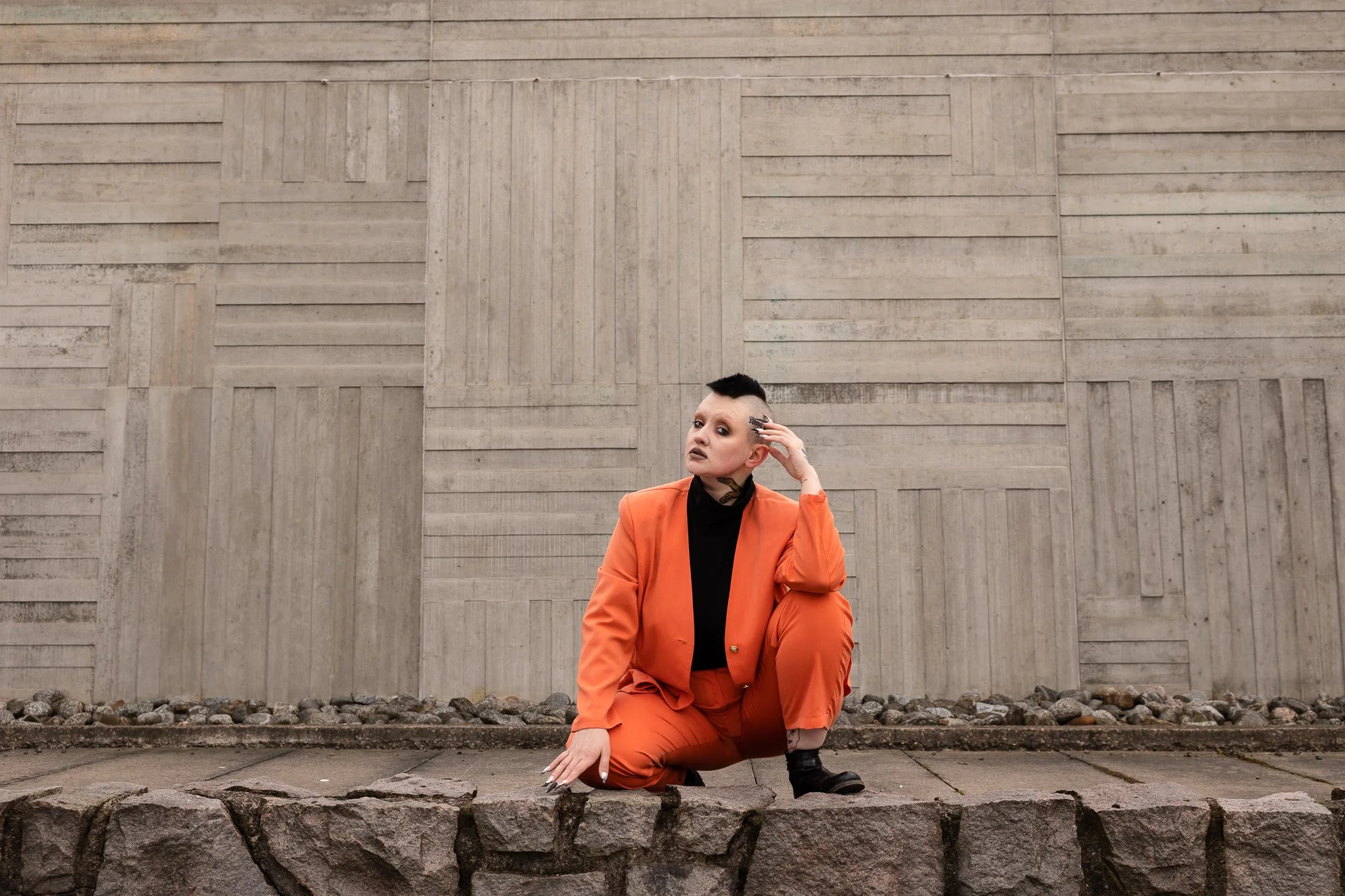 Tavoitteena oli monipuolinen galleria luovan ammattilaisen monipuoliseen työ- ja hupikäyttöön. Kulmikkaan puvun ja Pikin omannäköisen lookin innoittamina haimme inspiraatiota muotimaailmasta ja editorial-kuvauksista. Piki on inspiroiva taiteilija, jonka kanssa on aina ilo työskennellä!